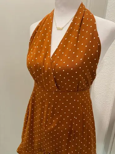 Forever21 F21 Rust Orange Brown & White Polka Dot Print Plunging Halter Open Back Romper Playsuit Wi... Show more