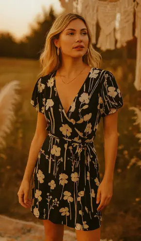 New w/partial tag. Chic faux-wrap jersey dress with a floral design and A-line silhouette. - sho... Show more