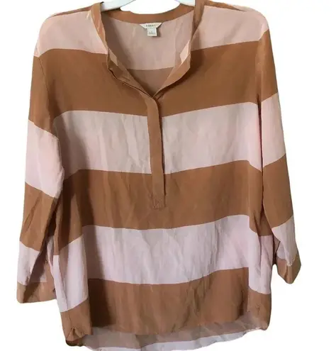 Striped a muted copper and blush tone . 100 % silk . Button partially down . Hidden buttons . Butto... Show more