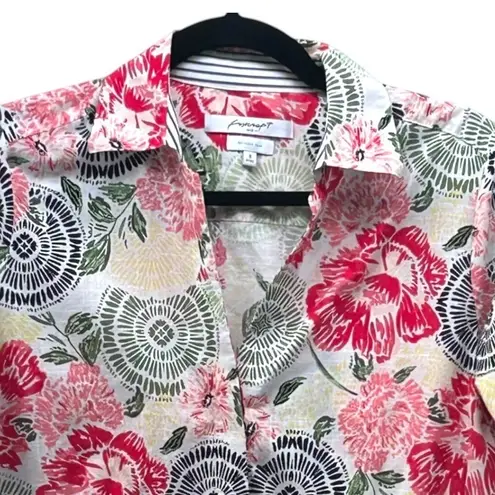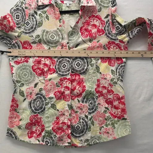 Brighten your wardrobe with this vibrant Foxcroft NYC button-up shirt, a perfect blend of playful style and everyday comfort. The eye-catching floral print, featuring bold blossoms and intricate circular motifs in shades of red, pink, green, and black against a crisp white background, brings a cheerful energy to any outfit. Designed for a flattering fitted silhouette, this shirt offers effortless elegance and is crafted to be wrinkle-free, ensuring you look polished from morning coffee to evening outings. Its versatile design makes it ideal for a casual brunch, a day at the office, or a weekend getaway. Measurements: • Pit to Pit: 20 in • Length: 25 in Type: Button-Up Department: Women Material: 100% Cotton Neckline: Collared Sleeve Length: 3/4 Sleeve Sleeve Type: Roll Tab Sleeve Pattern: Floral Accents: Button Theme: Nature Features: Easy Care, Non-Iron Fit: Fitted Fabric Type: Woven Occasion: Casual, Workwear Closure: Button Season: Spring, Summer Please contact me with questions. Item is from a smoke-free, dog-friendly home, laundered using a fresh-scent fabric softener. We use Dryel for dry clean only. Check measurements. 1 business day handling