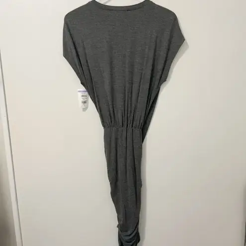 Grey jersey cotton dress from Frame with crossover shirred detail. Width across chest from underarm... Show more