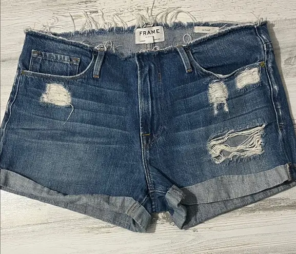 Chic frayed hem design. Classic blue denim. Perfect for casual outings. Bin 95