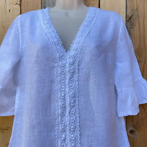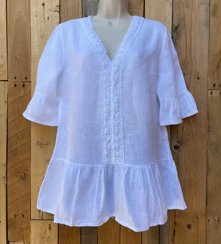 Beautiful linen top made in Italy by Francesca Bettini Lace detail v neck Size Small Approx dimensions 21” underarm 28” length I promise you will love this super cute and very well made peasant spring top. Color White Worn once Looks just like New Clean and absolutely no smell