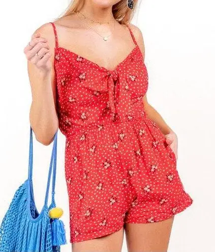 A great staple piece for your summer wardrobe! Adorable red floral romper with a tie across the bus... Show more