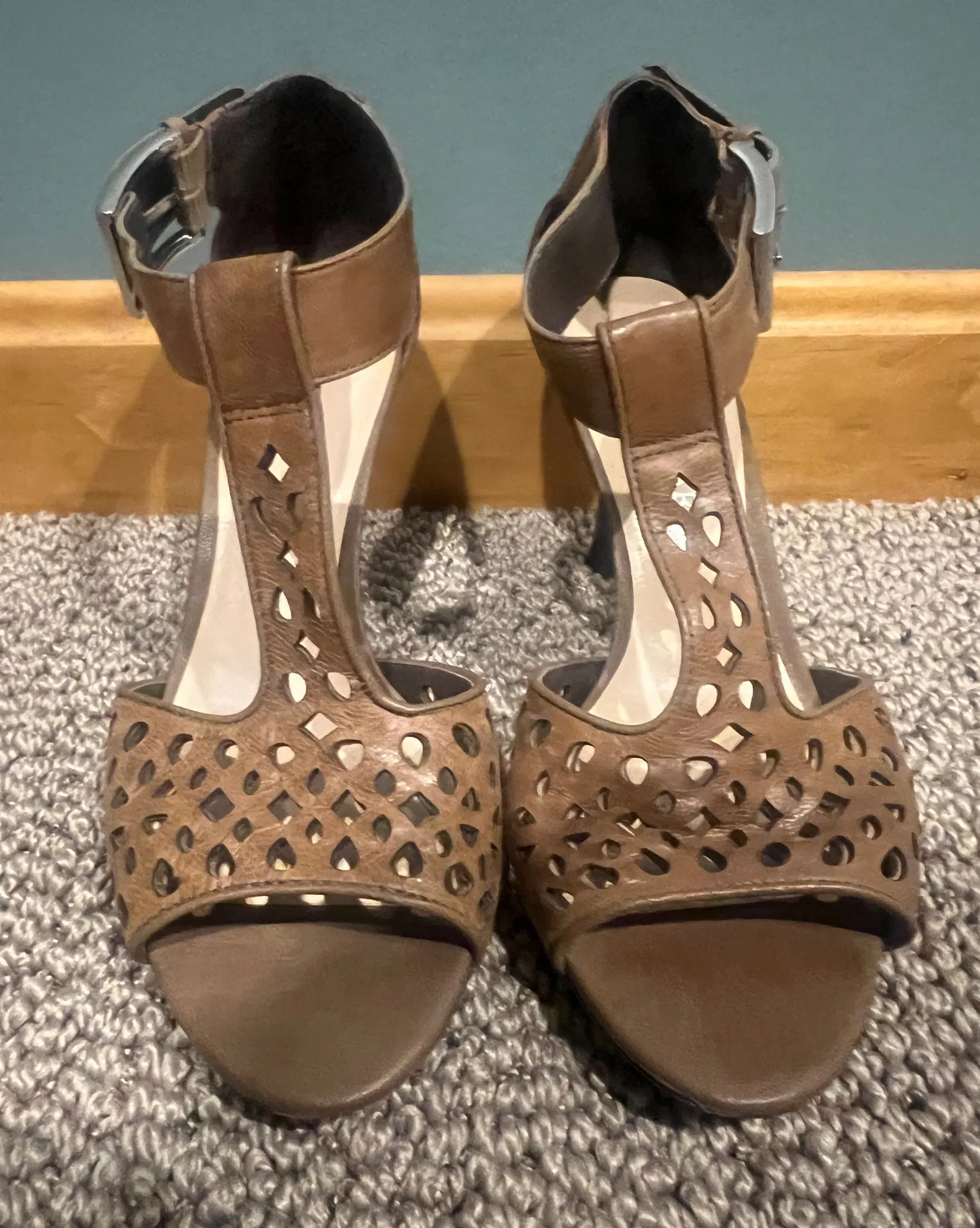 T-Strap Brown leather open toe 3 1/4” high heels by Franco Sarto in Size 6 in ver good condition Ver... Show more