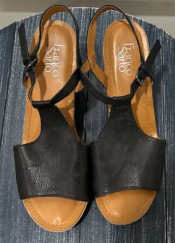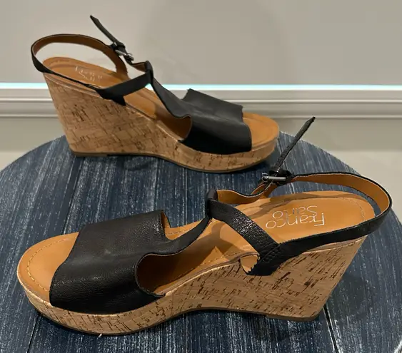 Franco Sarto platform wedges. Black leather upper that buckles around the ankle. Man made naturals c... Show more