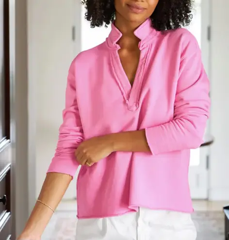 Frank & Eileen Patrick Popover Henley Top - Triple Fleece Pink Lemonade Size M Great gently used condition. No holes, stains Our runaway hit Popover Henley has a slight drop sleeve, sporty v-neck, and straight raw-cut hem that looks cropped without sacrificing any length or coverage. This piece takes you from running laps to lunch, from beach walks to brunch... Slightly cropped hand-cut raw hem and edges Collared V neckline Long sleeves Ships in 1-3 business days from a non-smoking home.
