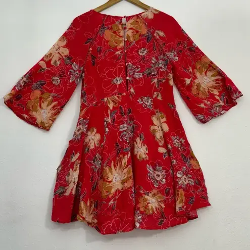 Vibrant red mini dress with floral pattern. Features a V-neck and flowy sleeves. Perfect for a casua... Show more