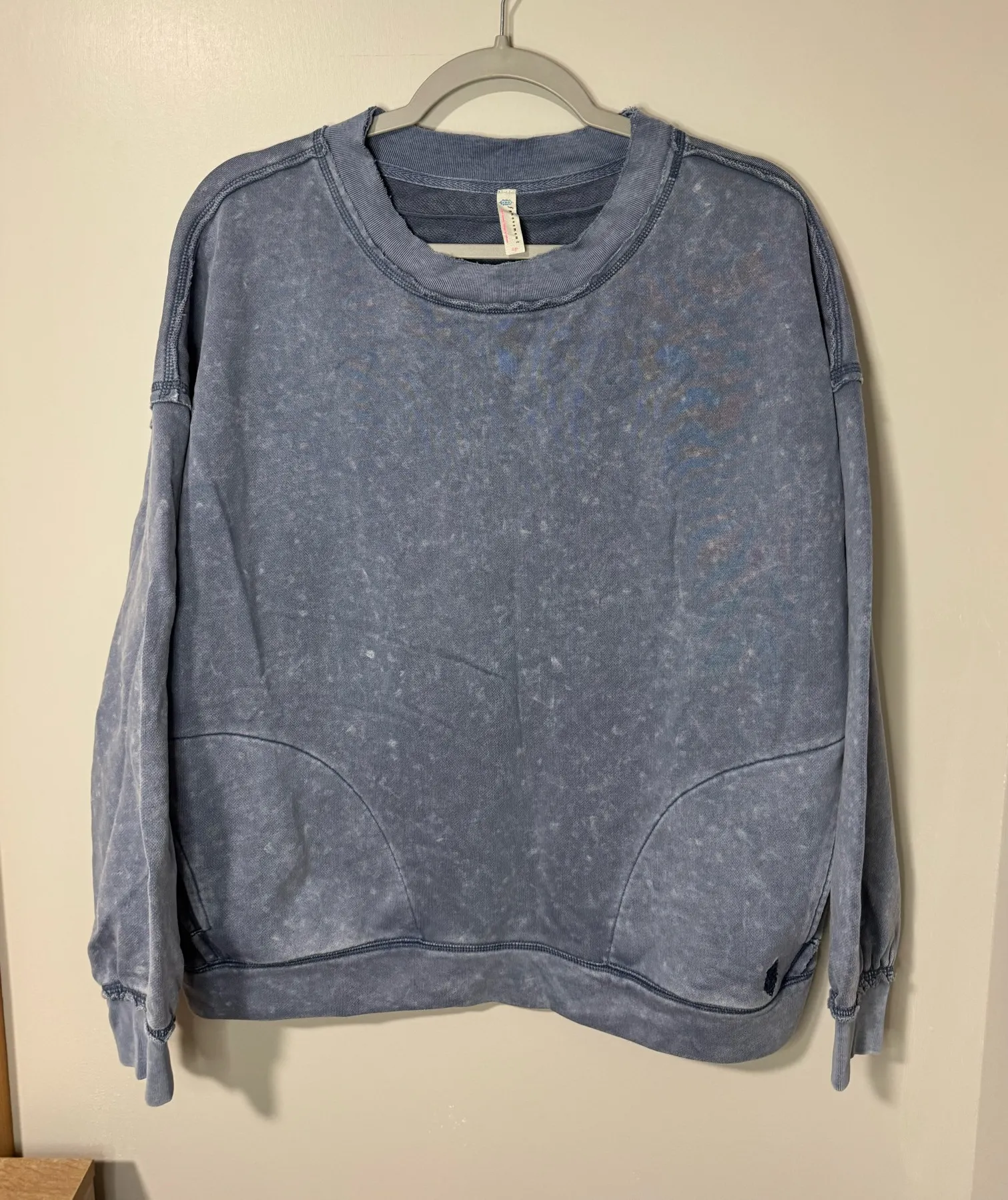 It is an oversized, crewneck pullover made from a cotton-blend material with a vintage, washed appea... Show more