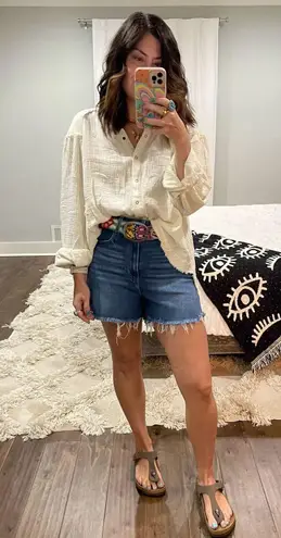 Style #: OB1694595 So sweet in a swingy, relaxed style, this textured button-front top features raw... Show more