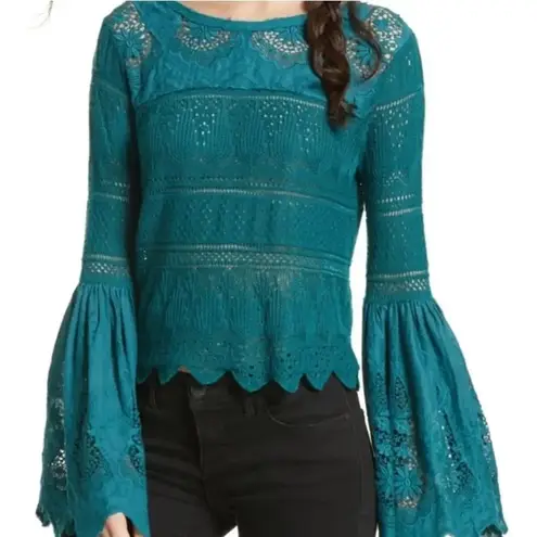 Statement bell sleeves Scalloped trim Keyhole in back with a button closure Lace material Trim: 100%... Show more