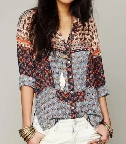 Free People One Samba Mix Button Down Shirt Boho Floral Patchwork Button front closure Side slits... Show more