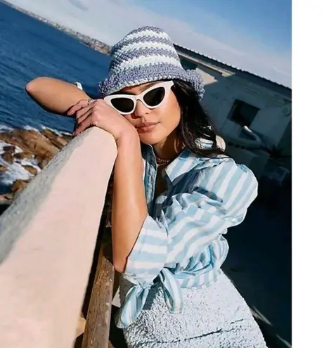 Free People Pixie Striped Crocheted Knit Bucket Hat Blue + White OS - One Size 100% Cotton