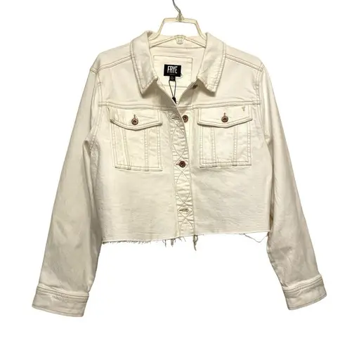 New with tags Frye cropped denim jean jacket in white. Collared, button front closure. Flap button c... Show more