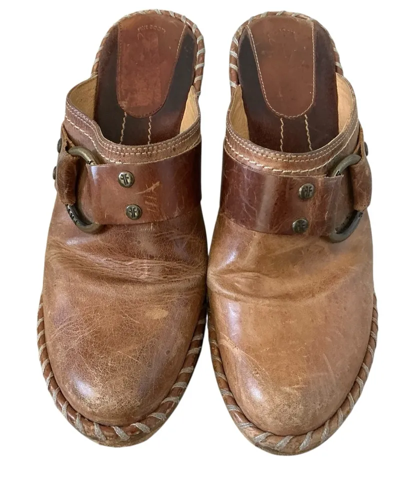 Distressed brown leather wedge slip on clogs harness ring detailing Shows wear,but no major damage... Show more