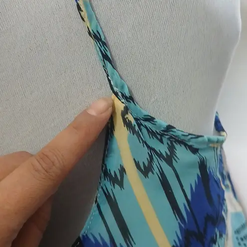 This stylish maxi dress features a vibrant blue and pink chevron pattern, perfect for any occasion. The flowing design offers comfort and elegance. this dress is super cute but it does have some small flaws one being the adjuster on the right shoulder is broken but the strap still moves, two I had to sew on the left side strap where's the seams came undone. and three there are a few light stains on the inside of the underlayer of the dress. so not really noticeable unless your really looking for it. please see pictures for more details. colorful. abstract prints summer sun dress dress maxi casual light weight sheer fun & flirt size small pit to pit measurement is 18 inches height from top of chest to bottom is 47 inches across waist is 12 inches waist line is a little stretchy