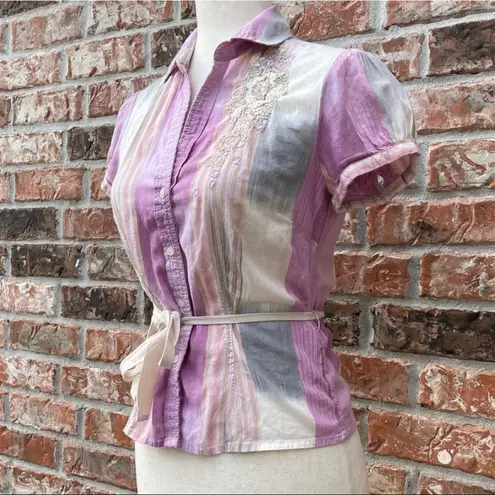 Adorable short sleeved, buttoned down purple and cream blouse from the Gap with a tie in the front a... Show more