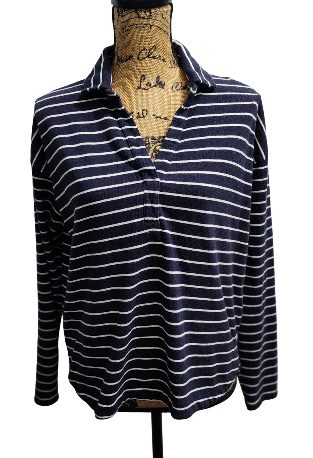 A classic and comfortable addition to any wardrobe: this Garnet Hill pullover top features a timeless striped design in navy and white. The long sleeves and relaxed fit make it perfect for layering or wearing on its own. With a stylish collar and a flattering neckline, this top offers a blend of casual elegance and everyday practicality. Ideal for weekend outings, or relaxed office settings. Chest 40 Length 24 Color: Blue Type: Blouse Department: Women Style: Basic Material: Cotton, Organic Cotton Neckline: Collared Sleeve Length: Long Sleeve Sleeve Type: Classic/Fitted Sleeve Pattern: Striped Features: Organic Cotton, Collared, Pullover, Comfortable, Relaxed Fit Fit: Relaxed Keywords: Garnet Hill, striped top, pullover top, long sleeve, navy white, organic cotton, casual top, women's top, medium, M, collared top, striped shirt, classic top, comfortable top