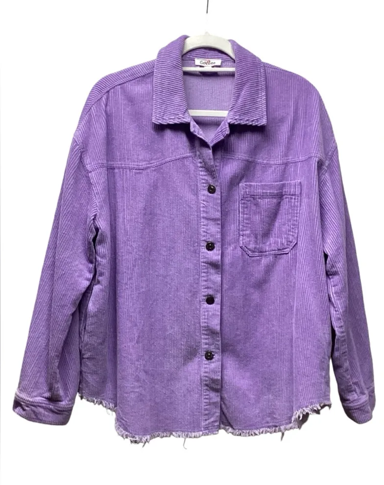 EUC. This shacket is mid weight corduroy with raw hem. Snap up front and snap cuffs. It also has pockets on both sides and one front pocket. Size Large. Light purple/lavender Ab105