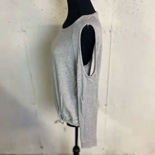 Lightweight stretch Super soft Tie waist One open shoulder(cute style) Color heather gray Size sm Approx bust 17" length 23" sleeve 29" Slight raw hem sleeve 69% viscose 12% cotton 4% spandex