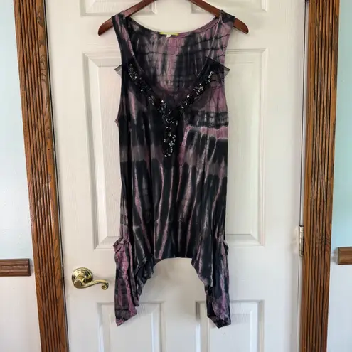 Bohemian vibes abound in this unique tank top! A captivating tie-dye pattern in shades of black and... Show more