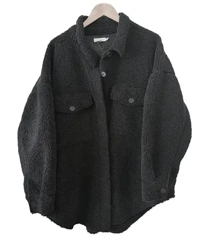 Cozy oversized sherpa fleece shacket by Good American in classic black. Features button front, chest... Show more