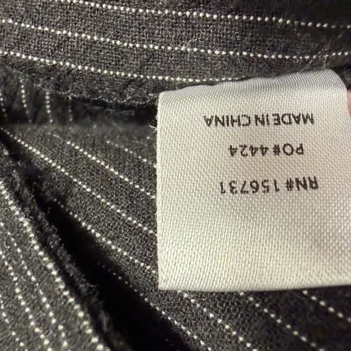 Effortlessly stylish lightweight jacket / tunic by Grade & Gather, featuring a classic charcoal gray base with subtle white pinstripes. Designed with a relaxed, longline silhouette, this piece works beautifully as a casual jacket, layering topper, or tunic-style outer layer. It features a notched lapel collar, button-front closure, long sleeves, and front patch pockets. The soft, breathable cotton-linen blend makes it ideal for transitional weather, office wear, or casual everyday styling. • Style: Lightweight jacket / tunic / longline blazer • Fabric: 55% cotton / 45% linen • Made in: China • Care: Hand wash • Condition: Very good pre-owned condition Measurements (laid flat, approx.) • Pit to pit: 22" • Length: 38" Grade & Gather jacket, longline blazer, tunic jacket, lightweight coat, pinstripe jacket, minimalist style, casual layering piece, workwear casual, modern boho