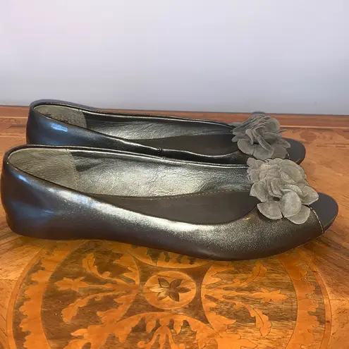 Pre-owned. All flaws are pictured. Some nicks at bottom of heel backs, one scuff, and wear to soles. The stuff on the sole that looks like mud is dried paint. Pewter gray patent leather with suede flower accents at toes. Very wearable and cute shoes. Soo