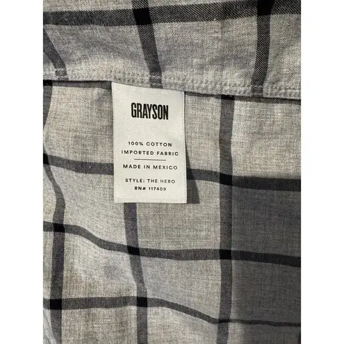 The Hero shirt in gray with black grid print-box plaid Button front V-Neck Long Button cuff sleeves... Show more