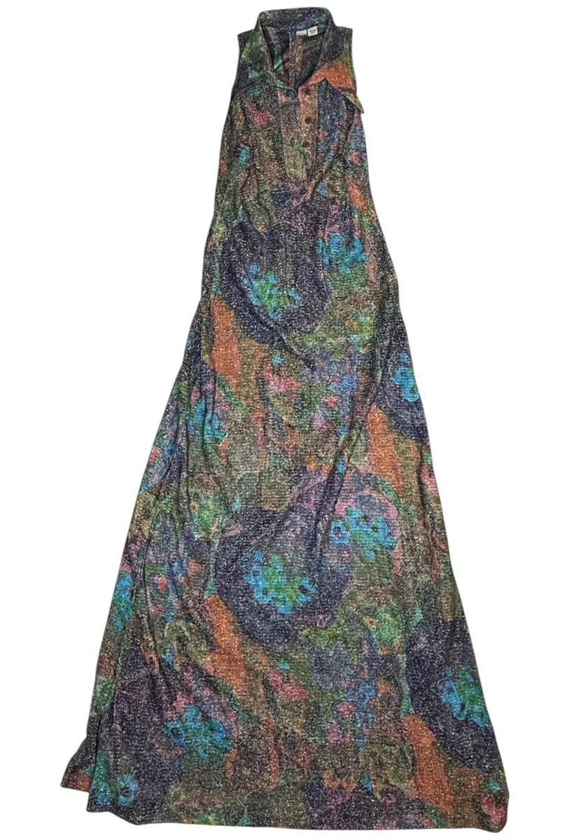 with a Splash of Psychedelic Fun Get ready to turn heads and maybe even start a dance party with this sleeveless maxi dress! Featuring a wild splash of colors and patterns that scream 'I woke up like this' but in a good way. Perfect for summer strolls, garden parties, or just pretending you're in a 70s music video. Collar and button details add a dash of sophistication to your boho vibes. Lightweight and flowy — because who wants to be weighed down by their outfit? Grab it now and let your inner flower child bloom! Vintage Size 11. Be sure and review measurements.