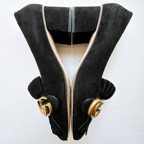 Authentic Gucci GG Marmont Fringe Block Heel Pumps in black suede. Iconic antique gold GG logo and l... Show more