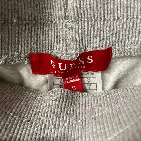 Classic light gray jogger pants with a black stripe on each side and “GUESS” printed down the sides.... Show more