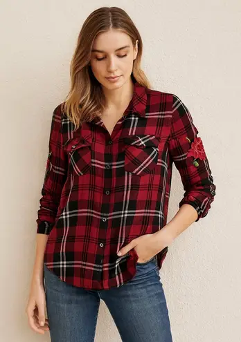 Pre-loved Guess Los Angeles red and black plaid flannel shirt with gorgeous floral embroidery on sle... Show more