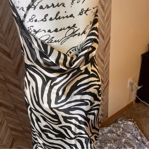 Divided by H&M gold and black zebra print satin slip dress has a cowl neck with a dropped & crossed back, Size Small