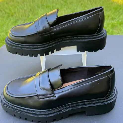 Elegant black loafers with a glossy finish. Features a chunky sole for added style. Good condition