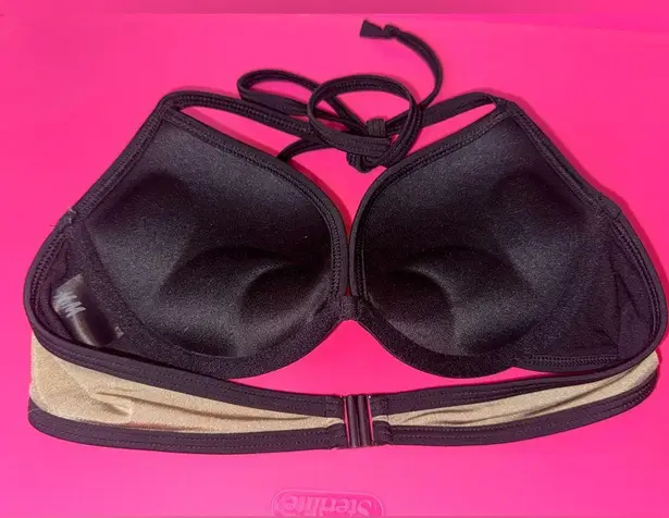 Chic khaki olive bikini top. Features bold black trim. Perfect for beach days. Halter top adjustable... Show more