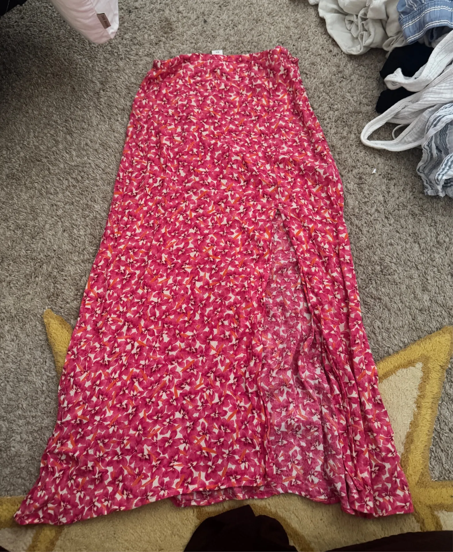 Super cute and flattering midi skirt. Love the pink and orange print and the slit on the side.