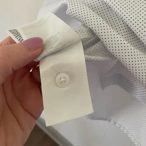 . Polyester cotton fabric blend White with tiny polka dot Extra button Good pre-owned condition... Show more