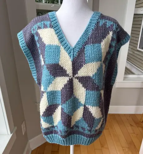 Hand knit Turquoise Blue White Purple Quilt Square Pattern Sweater Vest M-L Size L - $35 - From Katie