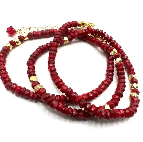 Minimalist necklace, Trendy Jewelry, Genuine Ruby Necklace , gift for her, everyday jewelry, choker necklace, beaded necklace, gemstone jewelry, Approximately 16.5” in length with 2” 22 kt gold plated extender. Necklace decorated with 3 mm gorgeous 22kt Gold Plated Copper beads. 22K Gold plated lobster claw clasp. Can be made to order.