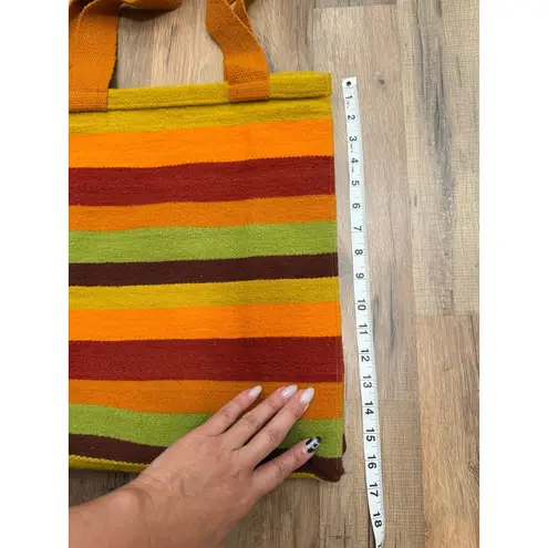 Authentic handmade Peruvian tote bag crafted from 100% wool. This artisan piece features vibrant horizontal stripes in warm tones of orange, red, green, yellow, and brown. Durable woven handles and sturdy wool fabric make it perfect for everyday use while adding a unique boho touch to your outfit. • Origin: Handmade in Peru • Material: 100% Wool • Style: Artisan Tote / Shoulder Bag • Pattern: Striped multicolor (orange, red, green, yellow, brown) • Size: Approx. 15" W x 17" H • Handle drop: 12" • Condition: Excellent, handmade artisan item Perfect for carrying books, groceries, market finds, or as a stylish boho accessory. ⸻ 3. Hashtags (5) #PeruvianArt #HandmadeTote #WoolBag #BohoStyle #ArtisanMade
