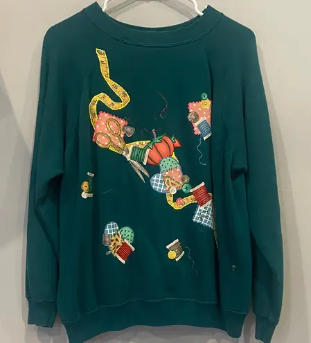 Teal sweatshirt featuring a colorful sewing theme design with buttons and thread spools. H Large... Show more
