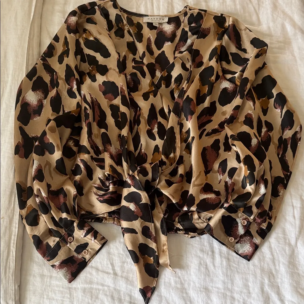 Stylish animal print blouse with tie-front. Perfect for versatile wear.