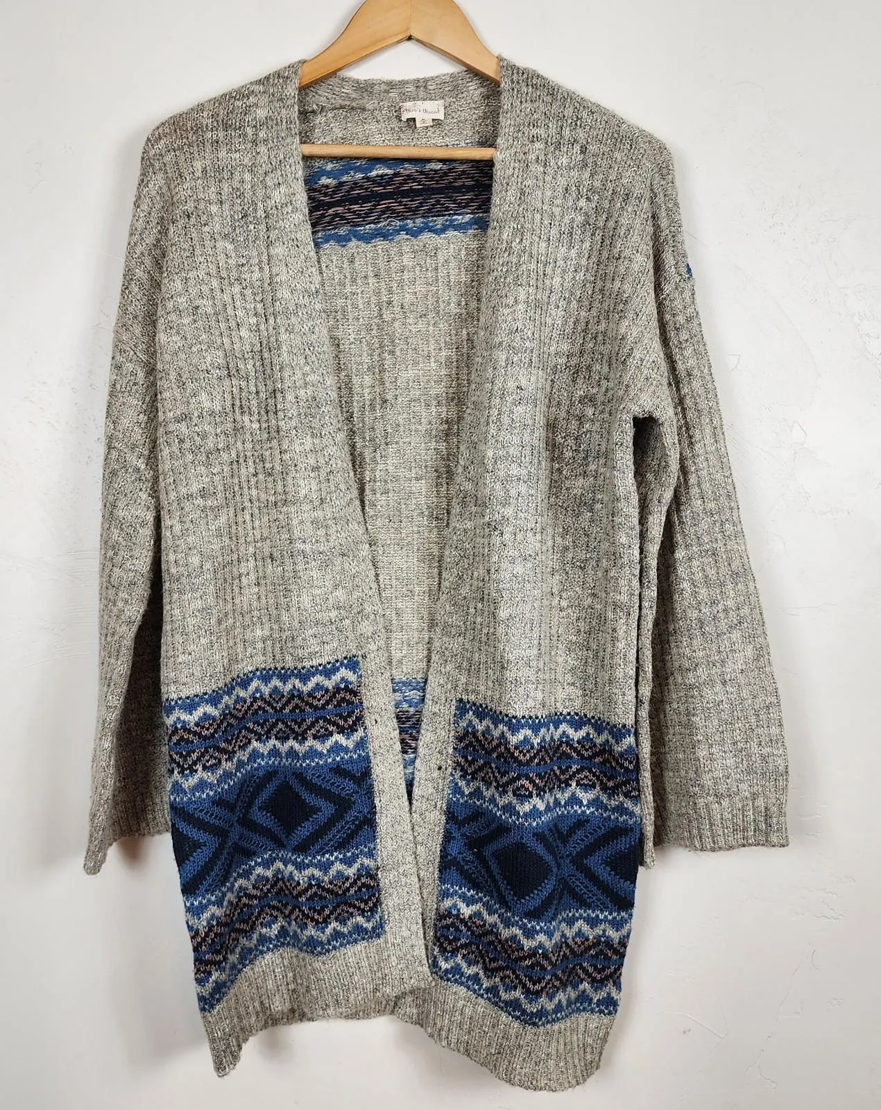 Cozy & Stylish Hem & Thread Open Knit Cardigan Sweater This is the perfect versatile piece for your wardrobe—ideal for layering during the cooler months. Features a beautiful, classic fair isle/aztec pattern in deep blue and white, contrasting perfectly with the neutral heathered knit body. Key Features: Brand: Hem & Thread Style: Open Cardigan, Long Sleeve Fabric: Soft, medium-weight knit Pattern: Fair Isle / Aztec geometric pattern on the hem and pocket area. Color: Heather Gray/Beige with Navy Blue, Light Blue, and White accents. Pockets: Yes (Patch pockets near the bottom hem) Condition: Excellent pre-owned condition. Measurements (Approximate - Laying Flat): Size Tag: Medium Length (Shoulder to Hem): 32 inches Chest (Pit to Pit): 21 inches Grunge. Cabin. Cozy. Preppy