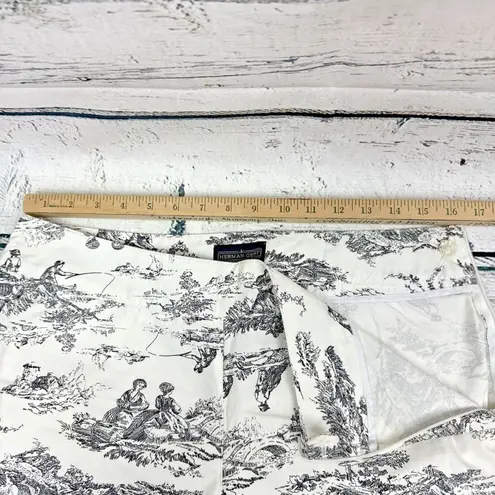 Chic cropped pants by Herman Geist, showcasing a sophisticated toile print. These trousers feature a classic black and white design, offering a timeless aesthetic. The material is a comfortable cotton, making these suitable for all-day wear. The cropped length provides a contemporary touch, perfect for pairing with various footwear options. These pants are a versatile addition to any wardrobe. Keywords: Herman Geist, Toile Print Pants, Cropped Pants, Black and White Pants, Womens Trousers, Size 12 Pants, Cotton Pants, Designer Pants, Classic Style, Printed Trousers