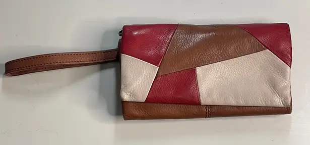 The HOBO Red and Brown Patchwork Clutch is a stunning accessory that combines elegance with a unique geometric design. Crafted with a mix of red and brown leather, this clutch features a convenient wrist strap for easy carrying. Its flat, rectangular shape makes it a versatile choice for any occasion, adding a touch of sophistication to your ensemble.