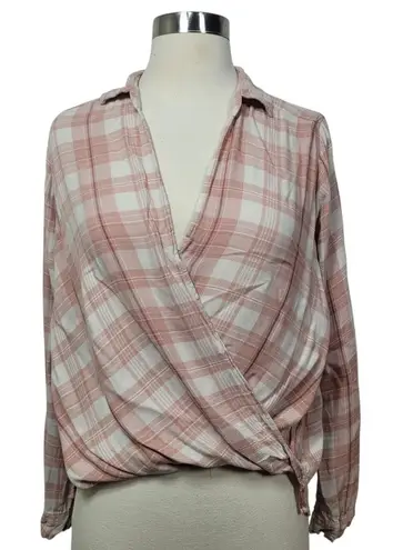 Stay effortlessly cute and comfy in this Hollister Pink Plaid Faux Wrap Top. Featuring a soft woven... Show more