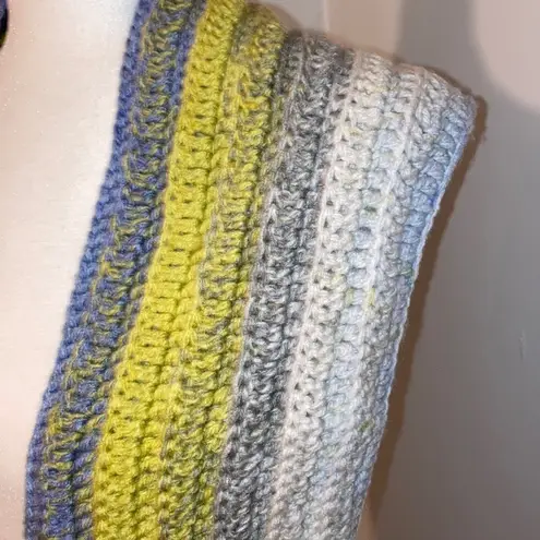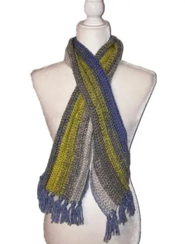 Blue, greenish yellow, gray & white homemade knit scarf. Scarf measures approximately 48 inches long, 7 inches wide plus 2.5 inches of fringe. Good pre-owned condition - no flaws noted Smoke free home