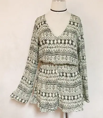 Bohemian flowing flared sleeves romper with V cut neckline and ruffle hem detailing. Back of romper... Show more