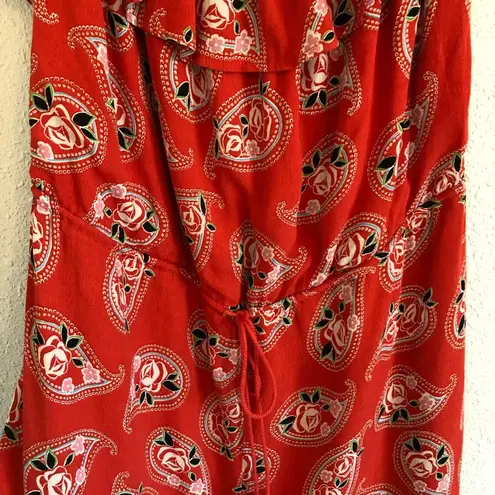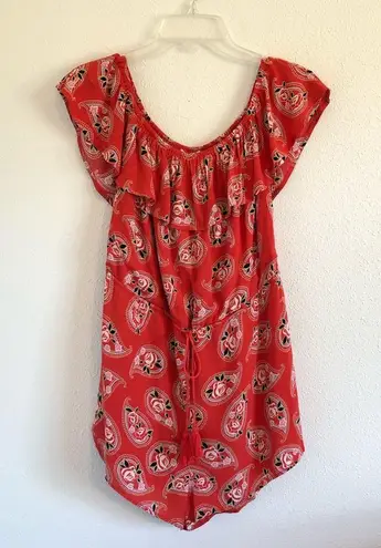 Honey Punch Off the Shoulder Romper - Bohemian Red with a floral design- fully lined- elastic waist... Show more